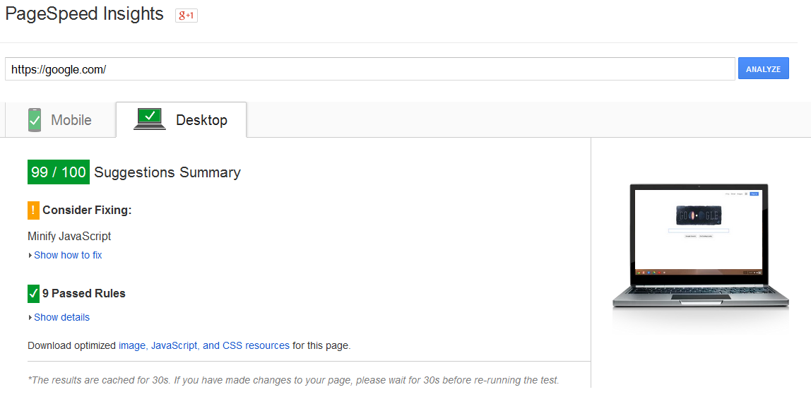 It tests the mobile version and desktop version against Google's rules to make sure that the site is readable and loads quickly. Once tested, you will get a results screen that will rate you on a scale of 0 to 100. Note that even Google.com does not get a perfect 100, so your aim should be to get at least 90.