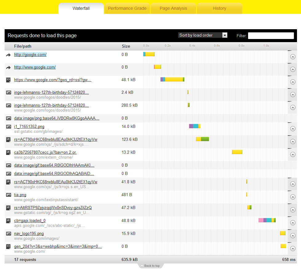 The real advantage of using Pingdom however is the ability to see a waterfall view. A waterfall view can show you if a piece of code is taking a long time to load and slowing down your website.